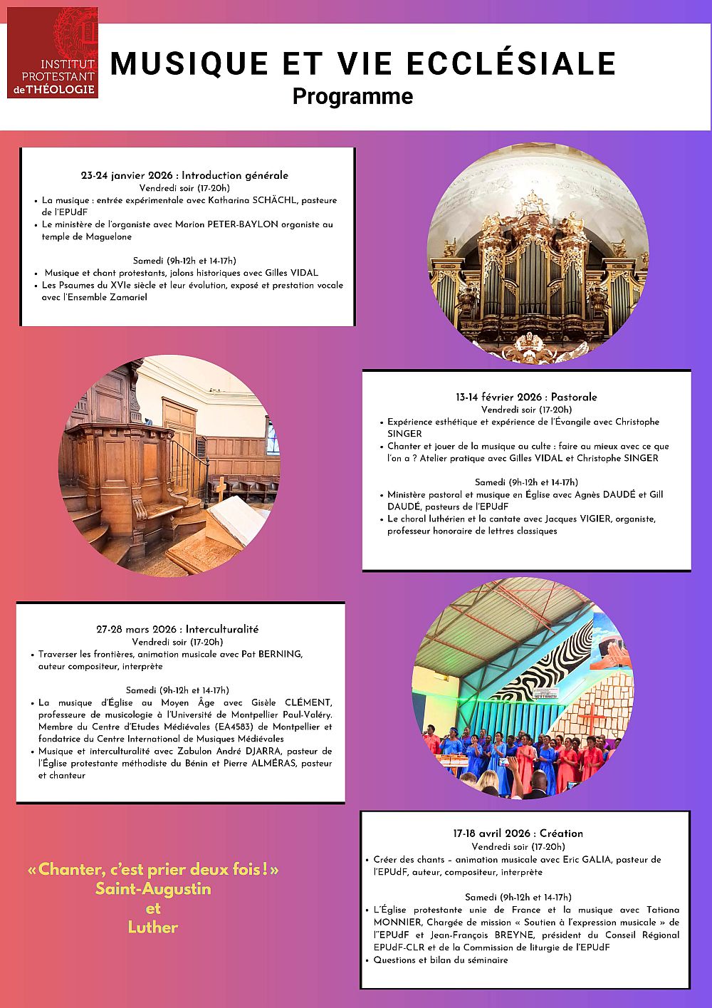 Ce séminaire est né du double constat de l’importance de la musique dans la vie ecclésiale et des lacunes dont souffrent un certain nombre d’Églises locales. Répondant à la double vocation de l’IPT, il relève d’une formation à la fois universitaire et professionnelle. Pour cela il se veut un lieu d’acquisition de savoirs, de réflexion interdisciplinaire, de sensibilisation à l’importance de la musique dans la vie ecclésiale et de formation de ministres, futurs ministres et responsables d’Églises. Il ne s’agit pas d’une formation technique (solfège, instruments, direction de choeur et autres), offerte dans d’autres lieux, mais d’une exploration de différentes problématiques liées à la musique et au chant dans l’histoire et la pratique des Églises chrétiennes et plus particulièrement protestantes. Dans une perspective interdisciplinaire sont pensés les enjeux identitaires, esthétiques, théologiques et pragmatiques de la réception du patrimoine musical aussi bien que des innovations en la matière.